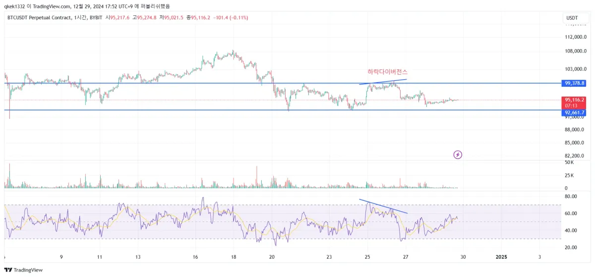 한시간 봉으로 rsi 추가 해보았습니다. 하락다이버전스 잡아봣습니다.