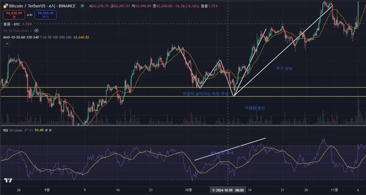 맞게 분석했는지 모르겠지만 RSI 추세와 가격을 이해하는 것이 쉽지 않은 것 같습니다.