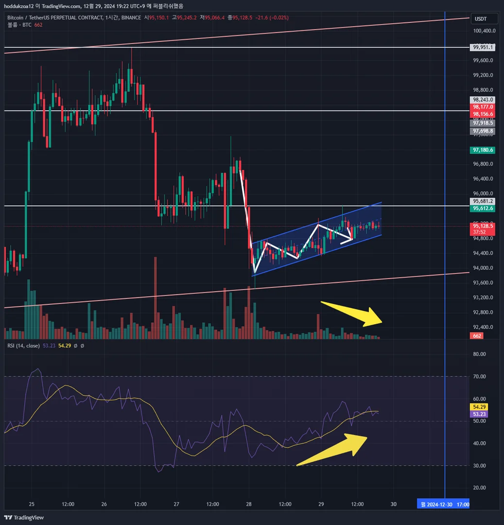 패턴을 보았을 때, 베어플래그라 생각됨과 동시에 거래량도 하락하는 것이 곧 93,500 까지의 하락을 예상하고 있습니다.