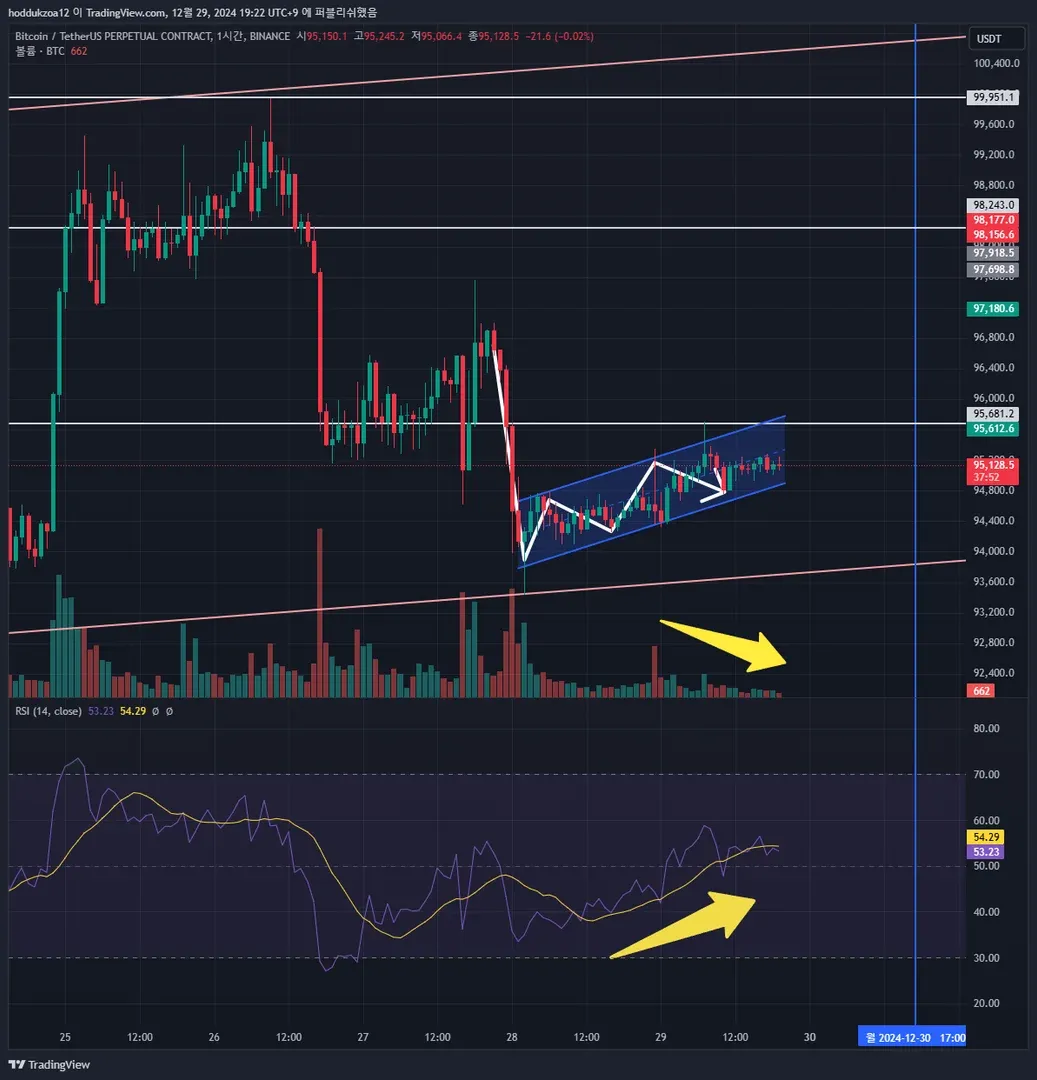 패턴을 보았을 때, 베어플래그라 생각됨과 동시에 거래량도 하락하는 것이 곧 93,500 까지의 하락을 예상하고 있습니다.