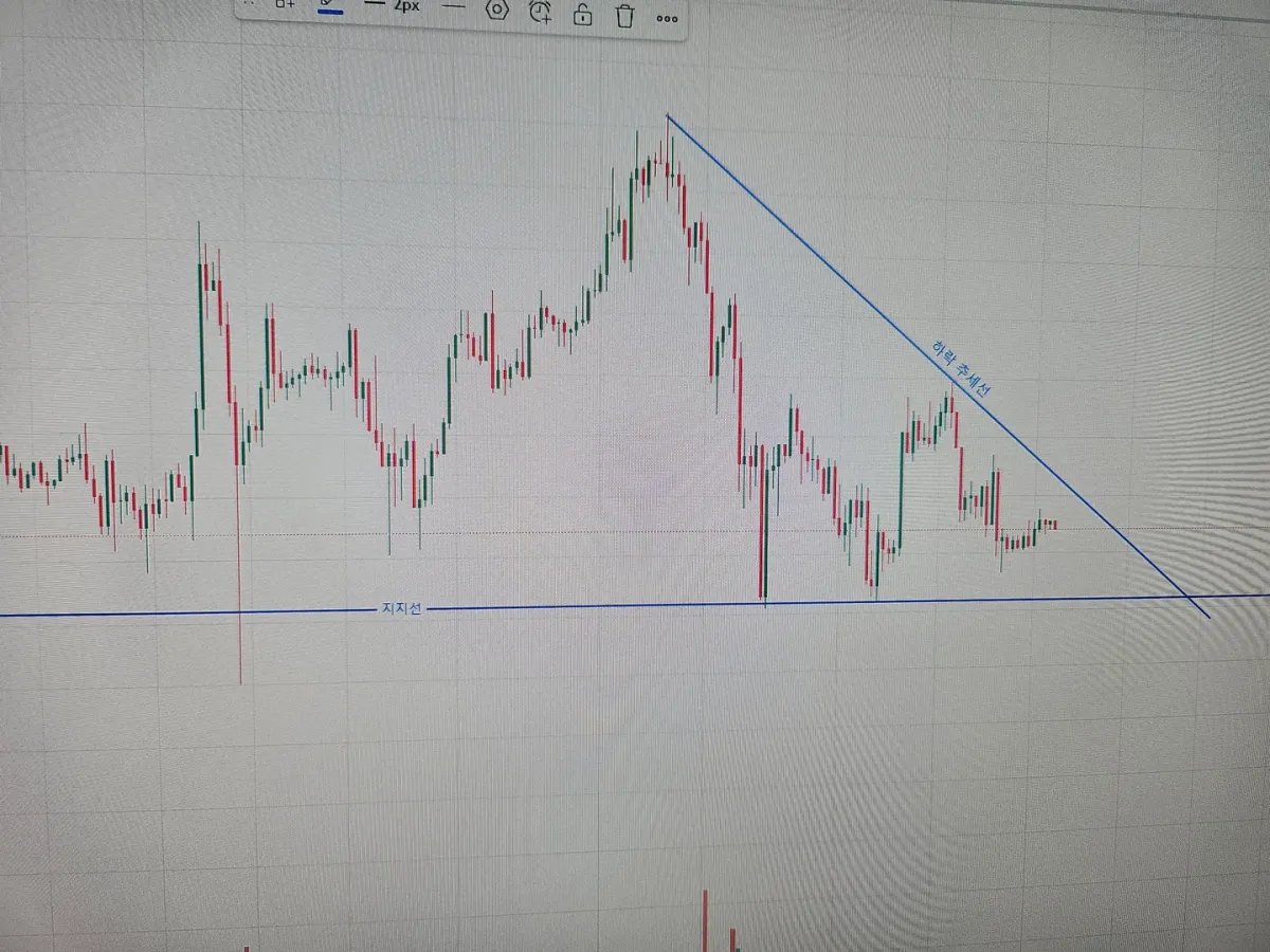 92.3K를 지지해주고 저구간이 강력한 1차 지지선으로 보입니다 그리고 지금 고점을 연결 해서 하락 추세선을 그렸을때 2터치 하락 추세선이라 아직 신뢰성은 높지않고 조만간 한번더 터치 하는지 관망해봐야할거 같습니다