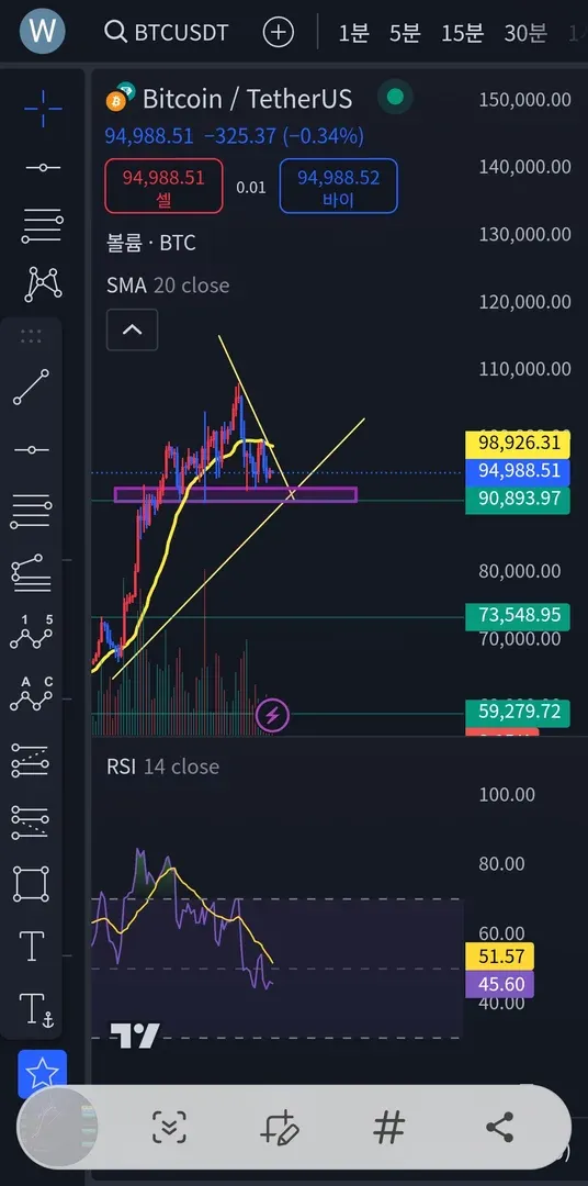 상승추세선 하락추세선을 그렸을때 삼각수렴을 하는것으로 보입니다. 보라색 네모 박스, 초록색 지지선이 겹치는 구간이 중요한 지지구간 일거같습니다. 지지구간이 깨지면 아래 두번째, 세번째 초록색 지지선들까지 내려갈수도 있을것같습니다.