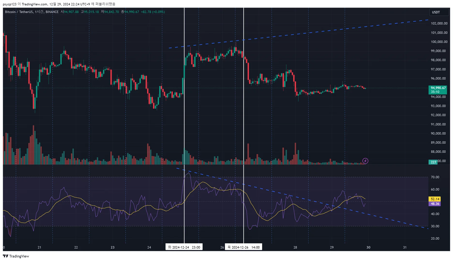 [30일 챌린지 7기 2주차] 비트코인 RSI 다이버전스 찾아보았습니다.