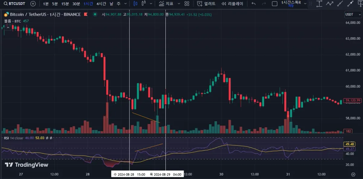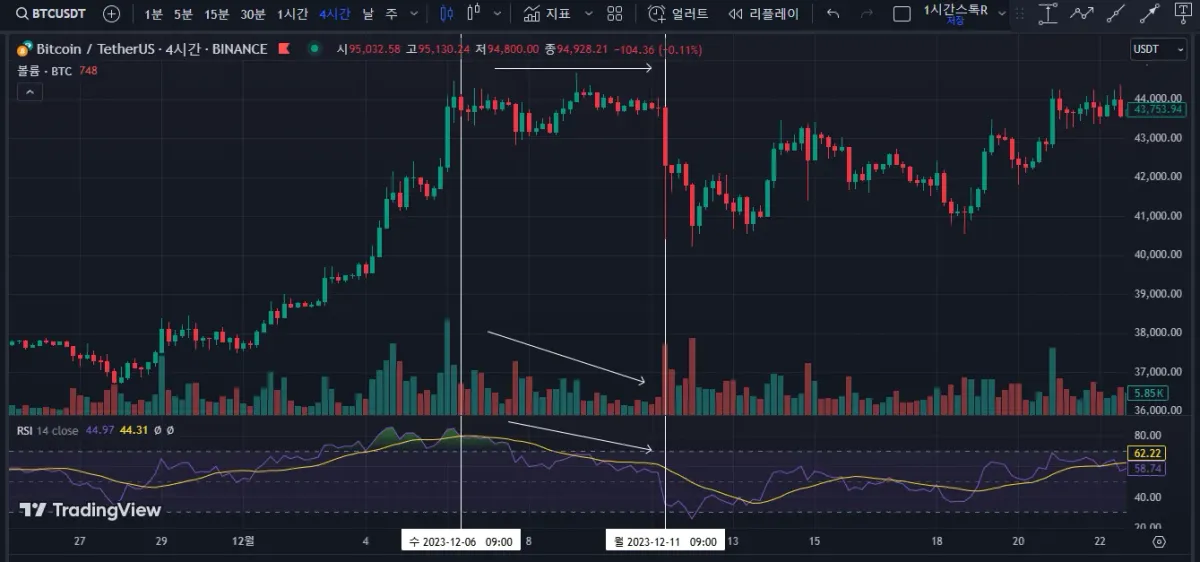그림1: 하락다이버전스 발생: 가격은 그대로 유지가 되나, 거래량이 감소하고 RSI가 하락합니다.