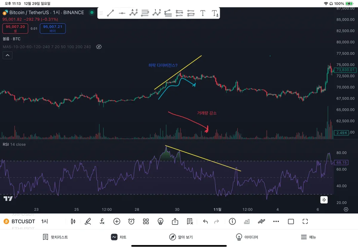 비트코인 차트에서 하락 다이버전스를 찾아봤습니다.