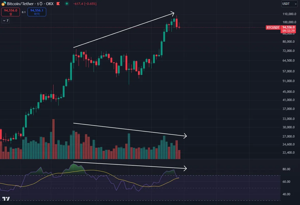 24년 3월 기준 가격은 올라가고 있는 반면 RSI는 오히려 고점을 낮추며 내려가고 있는 형국이며
