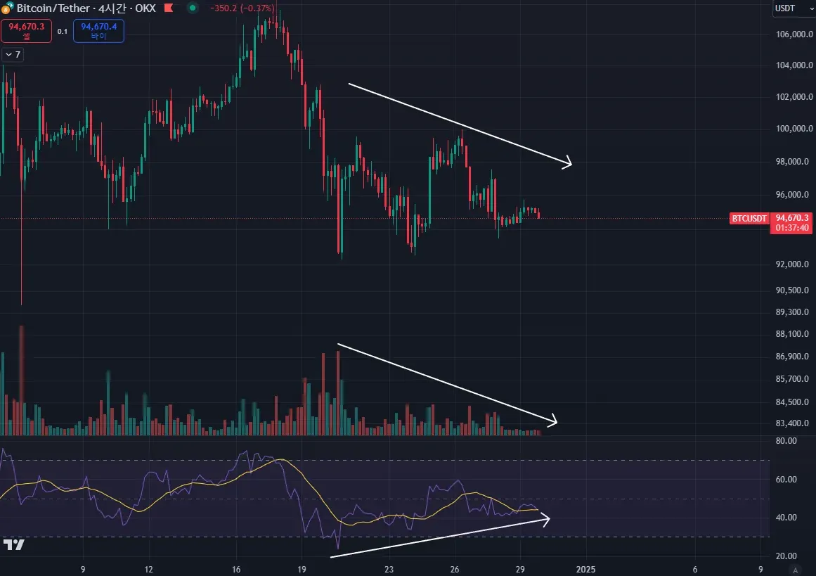 우선 현재 진행되고 있는 4시간봉 프레임에서 RSI와 다이버전스를 찾아보았다.