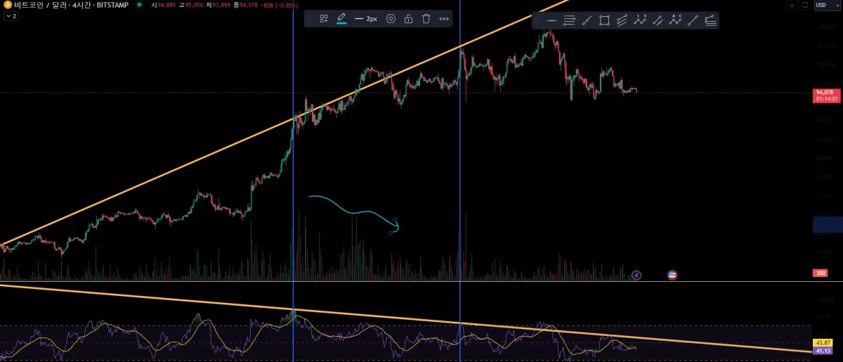 차트는 상승했지만 rsi는 하락, 거래량도 하락인걸 보아 하락으로 추세가 변환될 수 있다는 걸 암시하는 것 같습니다.