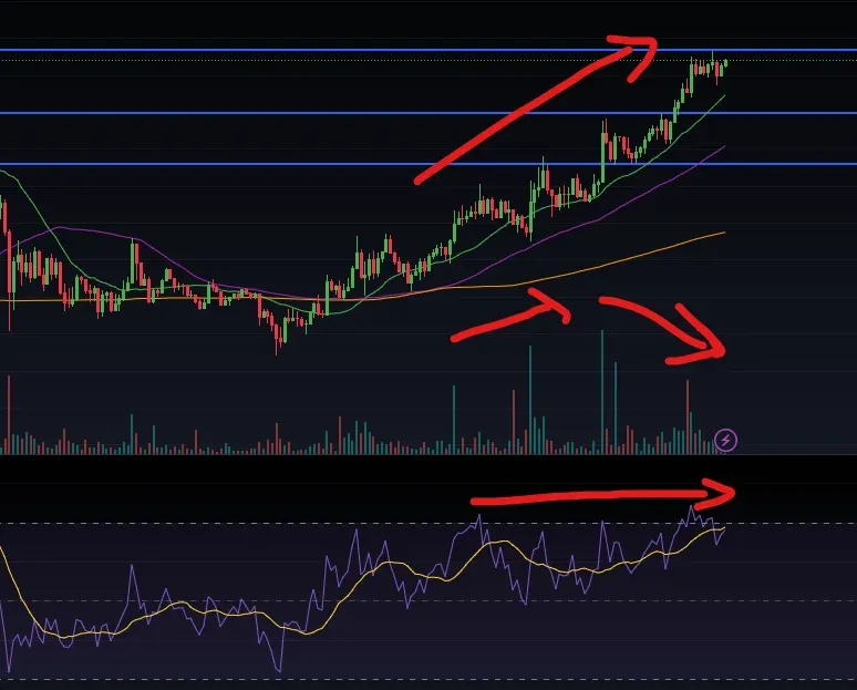 RSI 지표는 상대 강도 지수로 가격의 상승 압력과 하락 압력에 상대적 강도를 나타낸 것으로 거래량과 가격 세가지가 함께 지표 판단의 근거로 사용된다.
