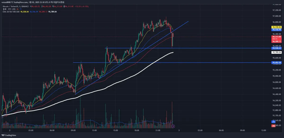 비트 상승중 추세선 뚫리며 하락.