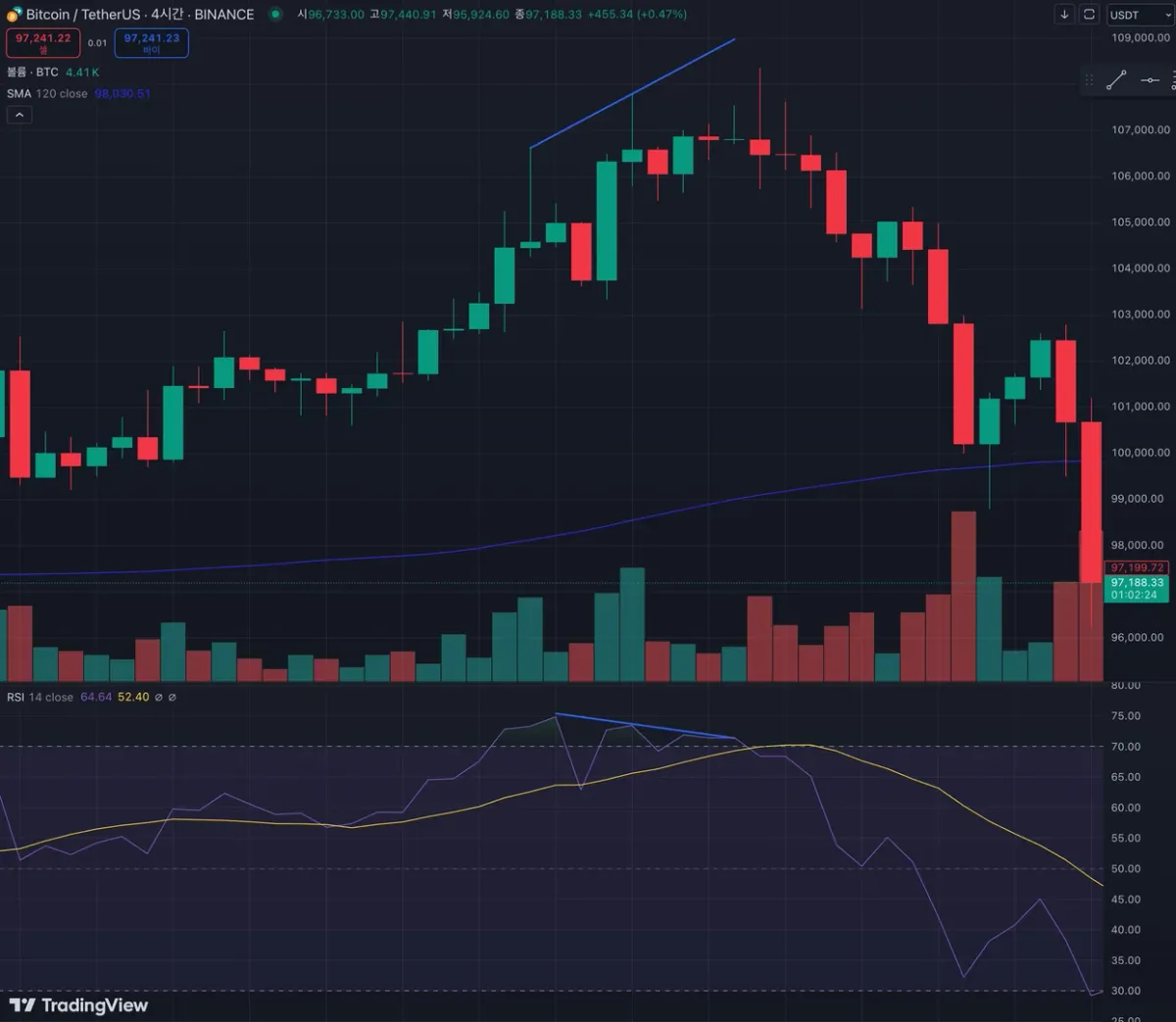 RSI 고점은 낮아지는데, 주가는 상승추세 이고, 거래량은 약해집니다. 실제 결과로 하락으로 이뤄졌습니다.