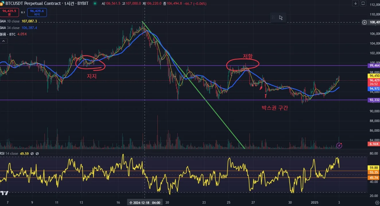 현재 방향성은 위에 저항선을 한 번 더 터치할지, 아니면 큰 저항성 밑에 작은 저항선을 맞고 내려갈지 확실한 추세를 모르는 상황이다.