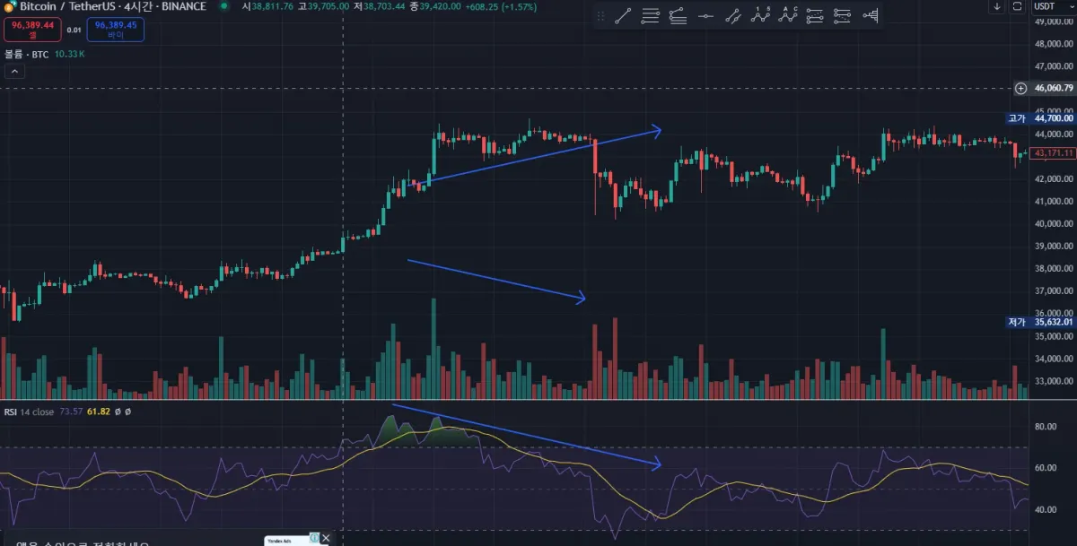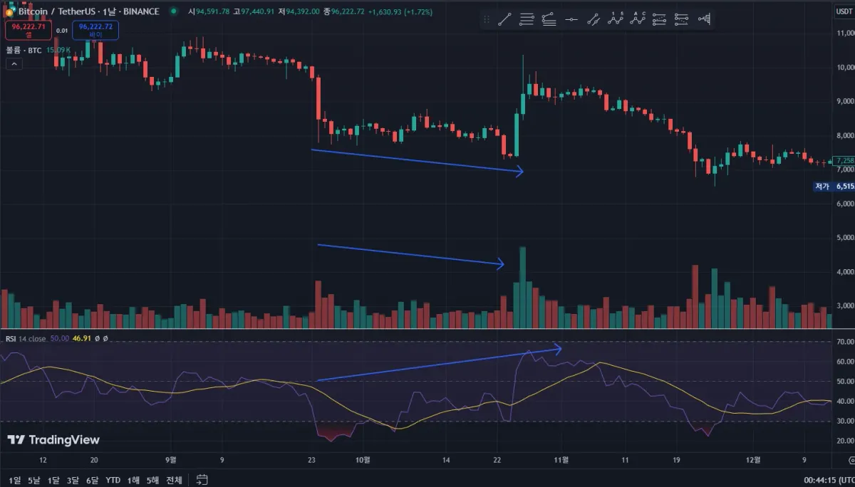 RSI70 이상으로 과매수 구간을 볼 수 있었고 이후 하락 중 거래량 감소를 보였으며 가격 고점을 넘기며 하락을 보여줬습니다.
