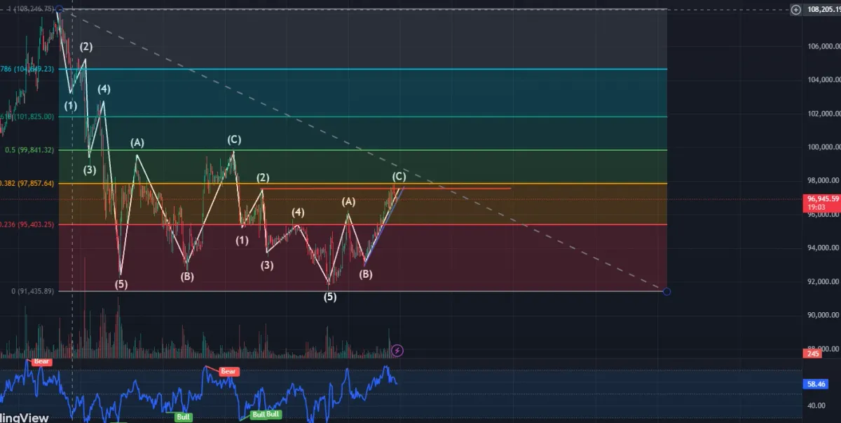 btcusdt 차트 입니다. 앨리엇 파동 작도를 이렇게 하는게 맞는지 궁금합니다
