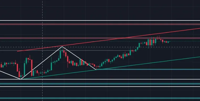 1시간봉에서 저점을 이은 추세선을 그대로 복사해 고점에 가져가 대봤더니 하나의 채널이 생성되었습니다.