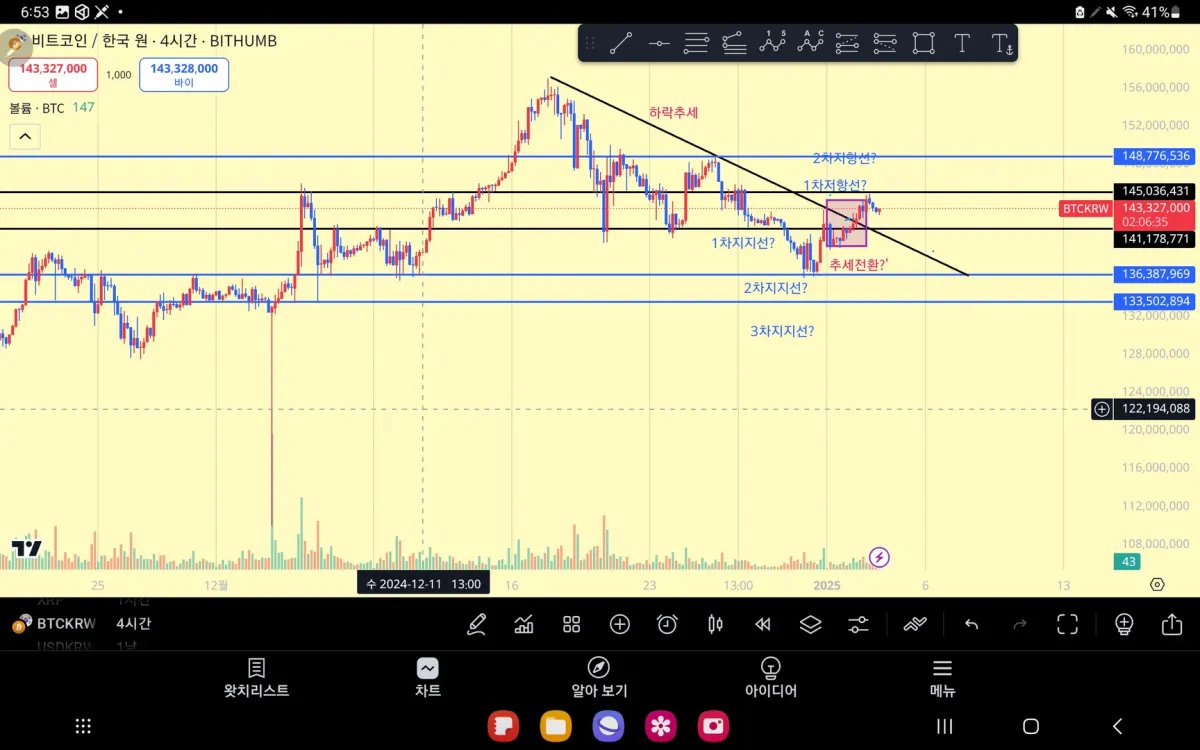 2차지지선부터 1차지지선 돌파를 성공하긴 했으나