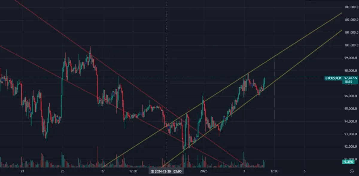 1시간 봉에 그어본 상승 추세선이 하락하는 지점에서 지지역할?을 하고있는 듯한 느낌이 듭니다.. (제대로 한 건진 잘 모르겠으나,) 약간 기분이 좋네요