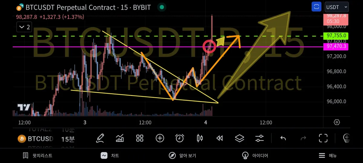 삼각수렴에서 상방 뚫고 올라가는 그림과 쌍바닥 보고 매수 진입 하였습니다. 좀 늦게 포지션을잡아 짧게 수익 익절 하였습니다.