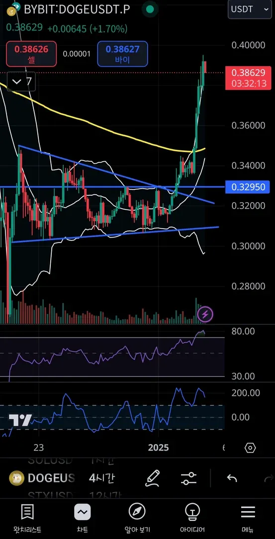 삼각수렴 돌파후 상단 추세선 , 지지선 분할매수 진행