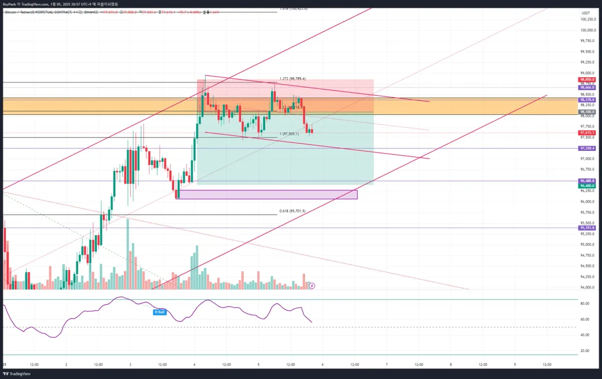 • 96400: 오더블럭(15m) 영역과 상승 전체 피보나치 되돌림 0.382 구간보다 살짝 위