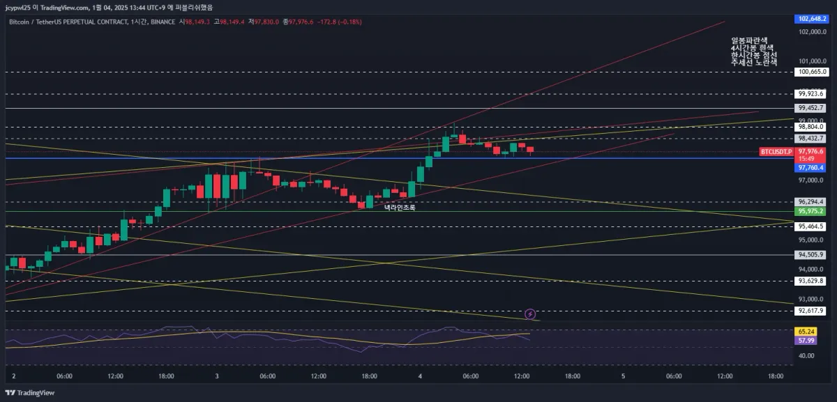 빨간 추세선을 못뚫어 주는걸 보고 98770에 숏 진입 현재 수익중