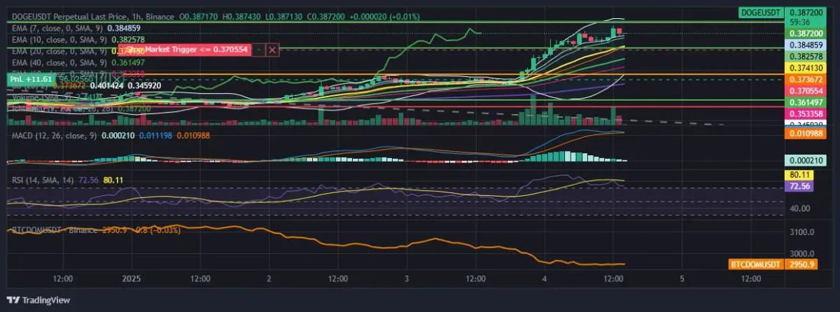 현재 잡고 있는 도지코인 롱 진입 근거는 이동평균선의 눌림, 볼린저밴드 간격 좁아짐, 1시간 봉의 20일선(노란선) 지지, MACD의 골든크로스, RSI의 기준선 진입, 비트코인 도미넌스의 하락 등입니다.
