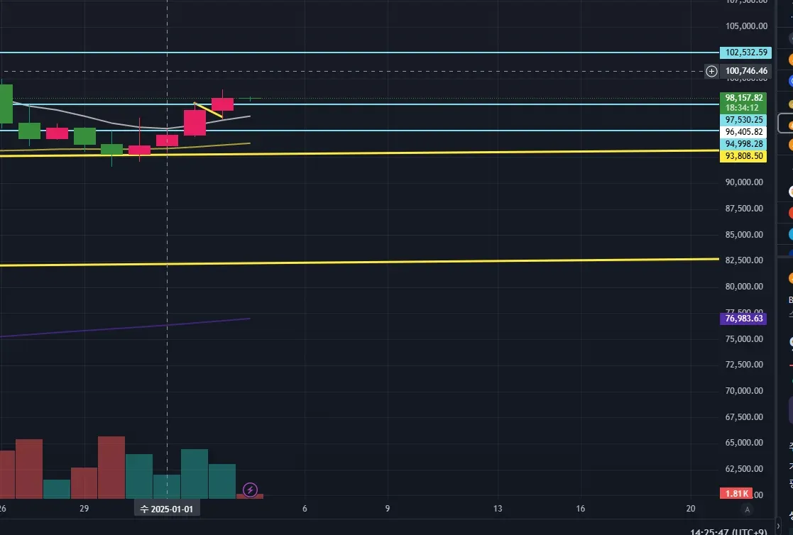 매물대와 거래량기준으로 저항/지지선을 만들고 저항선에서(93k, 96k) 매매하여 아직 홀드중입니다. 아직 매도를 하지않아서 수익인증은 아니지만, 2% 수익보는 중입니다.