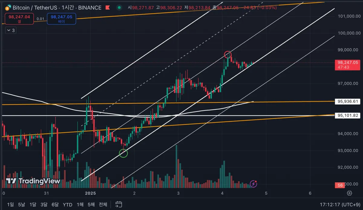 추세선이 맞는 98K 중,후반부터 저항이 나올거라고 생각하고 비트코인 숏에 들어갔습니다.