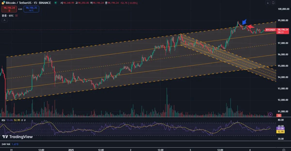 빨간화살표에서 저항확인후 98314달러에서 숏포지션오픈
