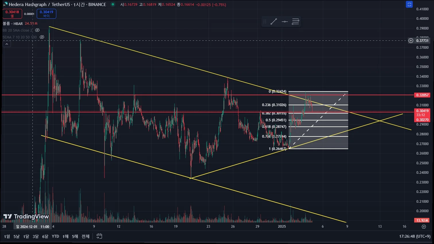 헤데라 코인 1시간봉 입니다 삼각 수렴 그래프를 그려보았고 상단 저항선을 뚫을려고 3번 시도하였지만 3번 다 실패하였기때문에 트리플 탑 패턴이 보여 숏 진입 하였고 피보나치 되돌림에 따라 0.382 부근에 오면 수익 실현할려고 합니다!