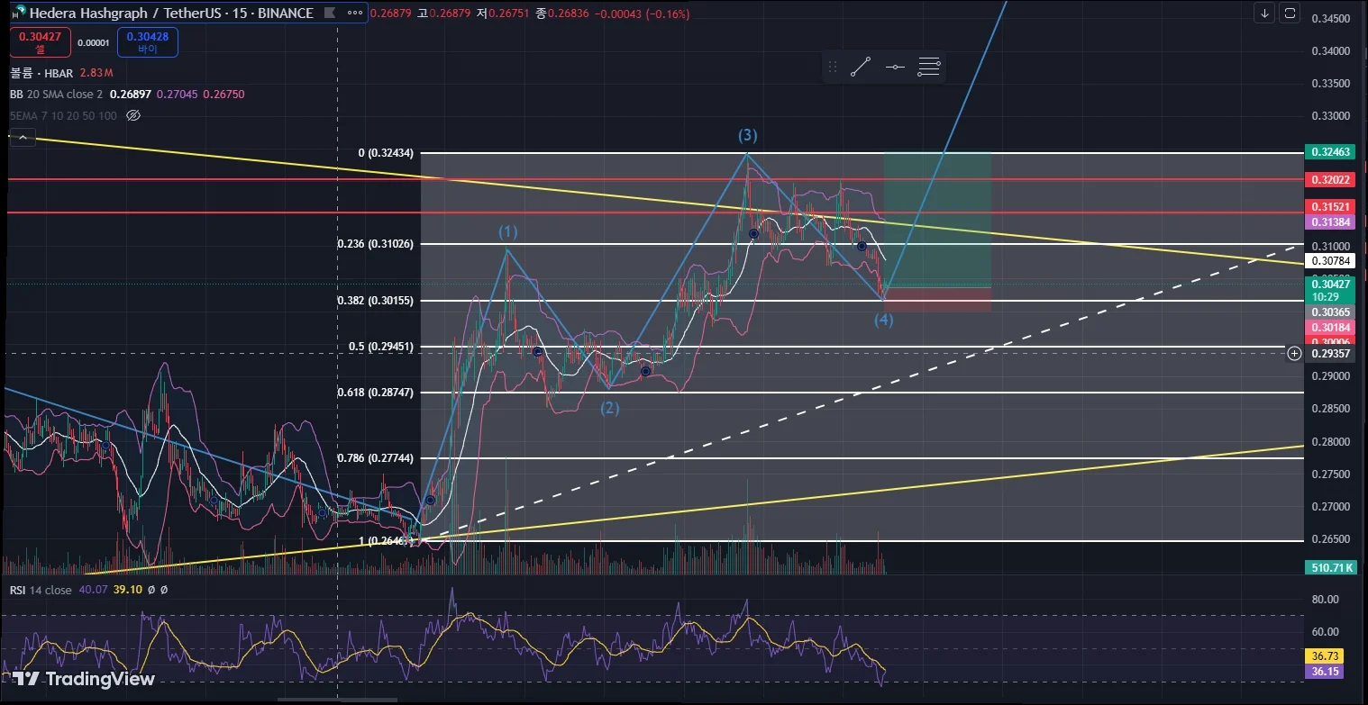엘리어트 파동 이론에 따라 5파동이 나올 수 있다고 보았고 RSI 강도 지수 또한 낮아졌고, 볼린저 밴드 하단을 이탈하여 상승 추세가 나올 수 있다고 보았습니다 또한 피보나치 배율 0.382에 도달하였기 때문에 롱 진입을 하였으며 만약 0.382 이탈 시 손절할 생각이구 삼각 수렴 저항선을 뚫는다면 익절할 생각입니다