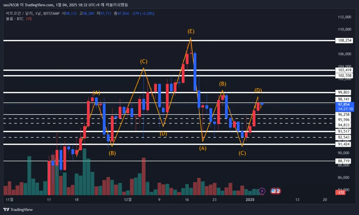 실습강의를 수강한 후 비트코인 차트를 작도해서 혼자 차트분석을 해본뒤 추후 바이비트 모의트레이딩을 통해 롱배팅을 해봤습니다.