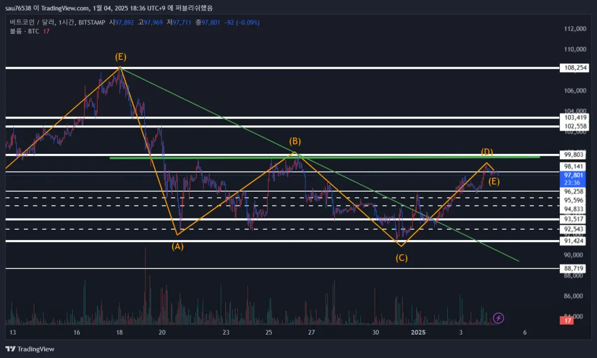 1일 4시간 1시간으로 총세분 분할해서 차트 분석을 진행해보았으며, 지지 저항 및 의미있는 추세선을 그어서 향후 어디 방향으로 흘러갈지 판단해보았습니다.