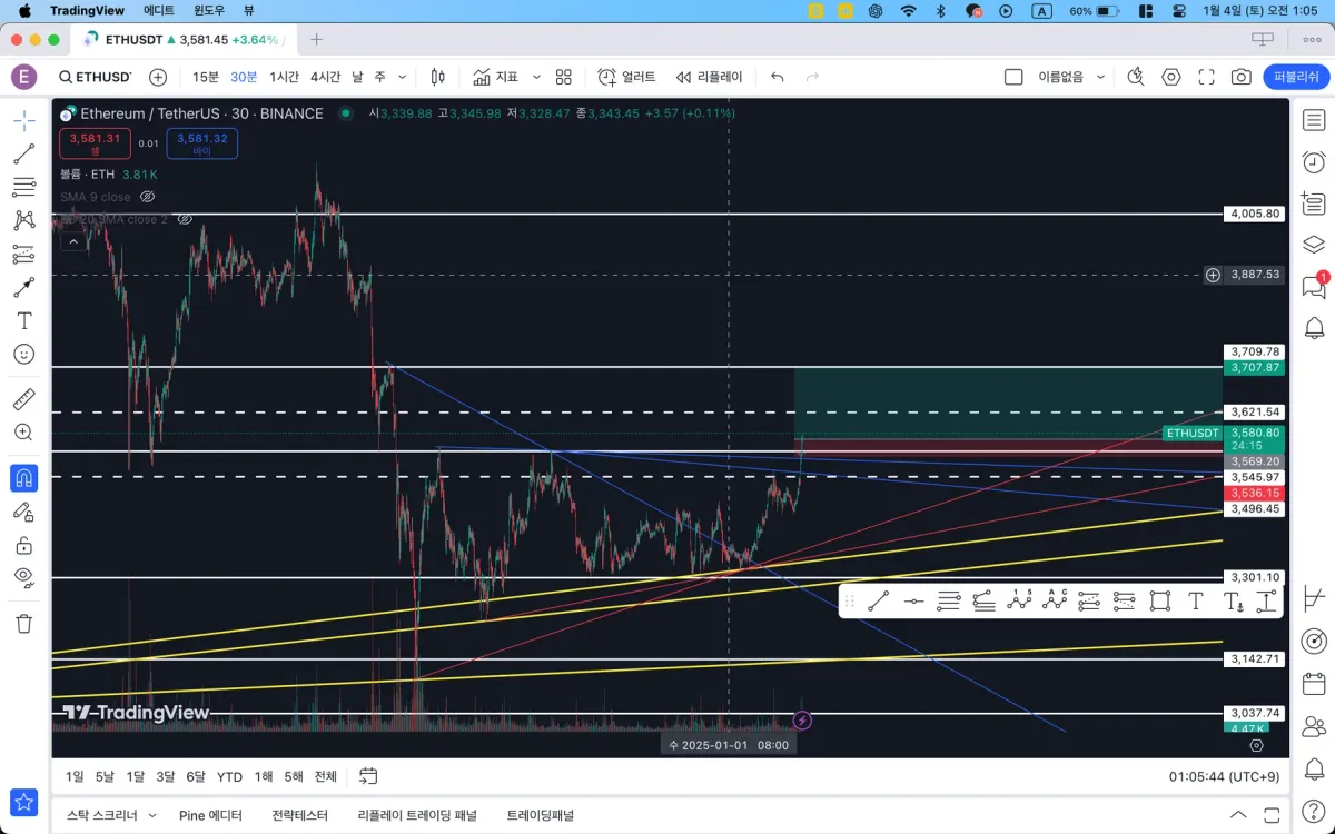 3. 3700usdt 부근에서 큰 저항이 발생할것으로 판단하여,, 익절 구간을 저정도로만 생각했습니다.