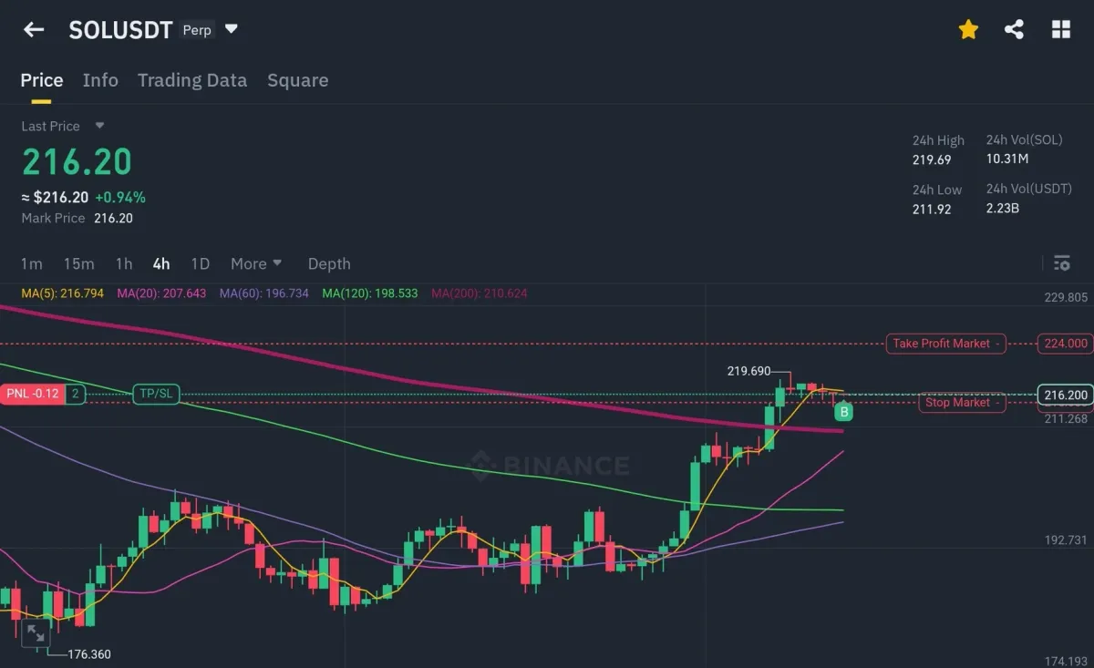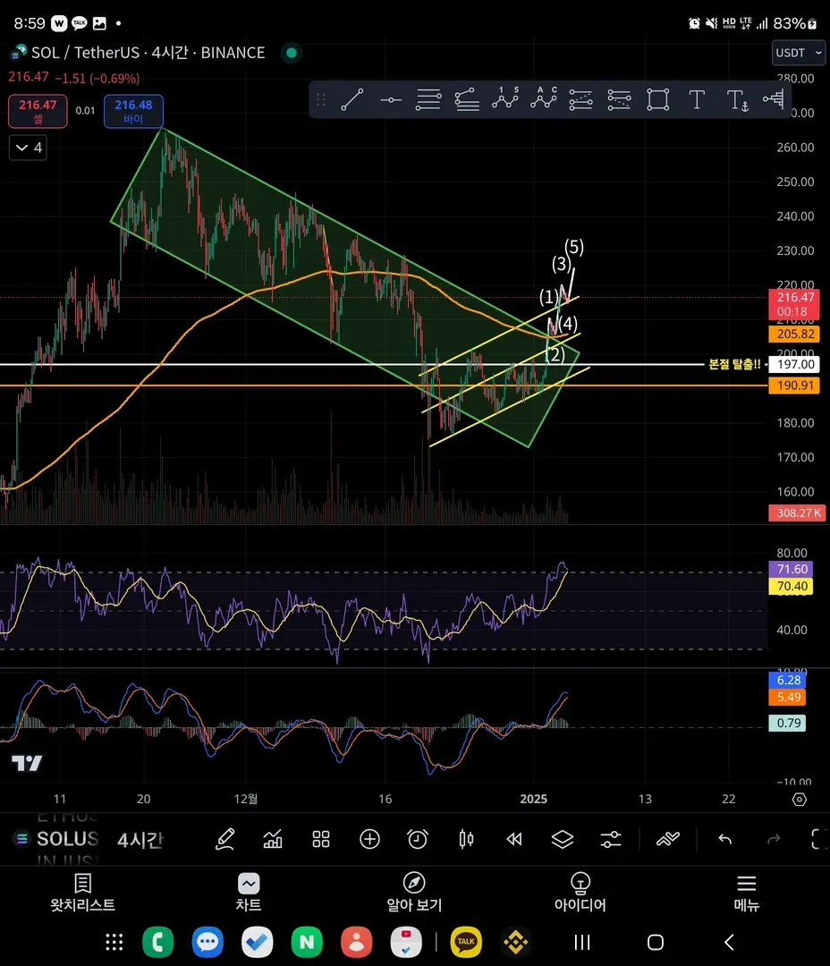 솔라나 지겨운 삼각수렴을 끝내고 (삼각수렴 고점에서 사서 본절 탈출했지만) 상승과정에 5번파동이 한번 더 남았다고 보고 진입 해보았습니다. 손절가는 215 SOL 로 설정하고 익절가는 225 SOL로 설정하였습니다