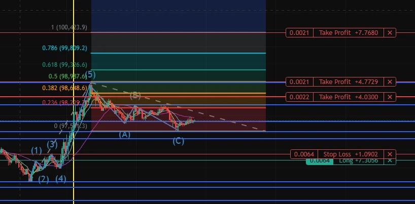 계획은 1차 익절 이전 매물대 물려있는 구간 이고, 2차는 피보 확장 0.5라인, 최종 익절 피보 1라인 입니다.
