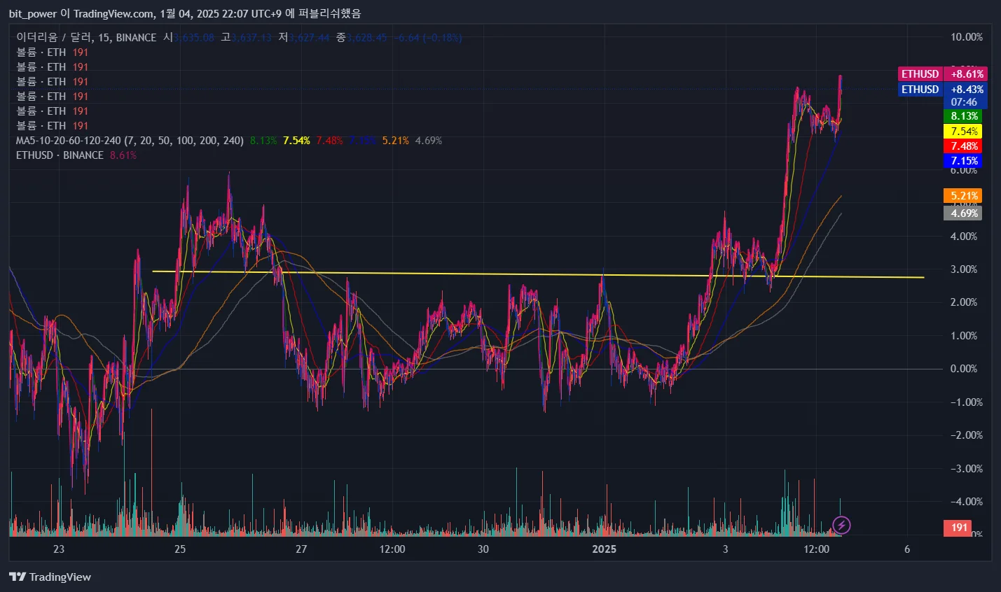이더리운 15분봉으로 저항이 지지로 변화, 상승 추세로 바꼈다고 판단되어