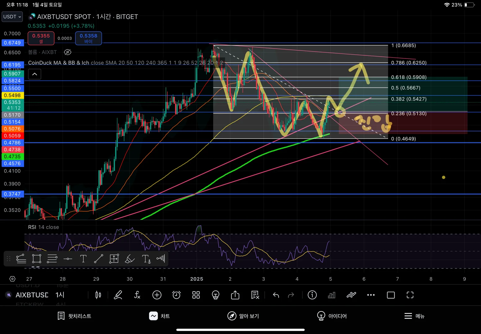 큰 상승 추세선과 지지선이 만나는 지점을 다음 진입구간으로 잡아봄(노란 동그라미)