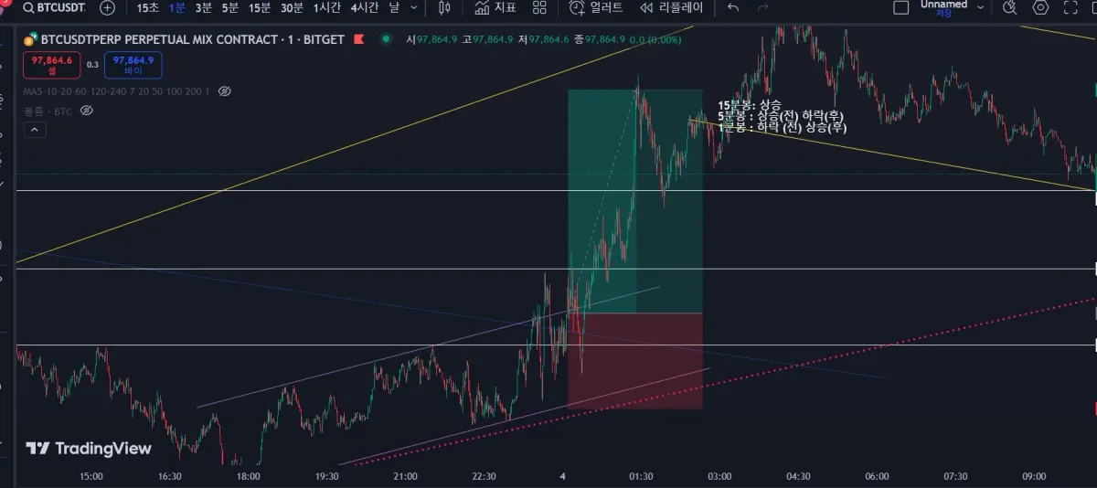 (아직 트레이딩뷰 무료버전을 쓰고 있는 관계로 15초 봉이 지원되지 않아서 1분봉으로 매매를 진행하였습니다, 또 매매가 끝나고 매매일지를 작성하는 점 양해 부탁드립니다.)