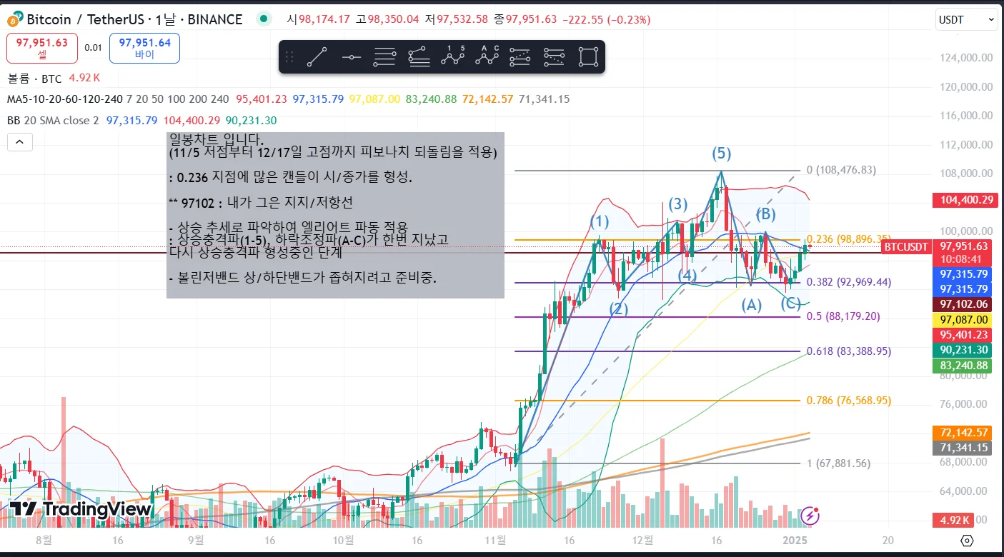 12/30이나 31에 매수 들어갔으면 좋았을걸.. 피보나치 되돌림 0.382 에서 반등하여 상승추세에 있으며