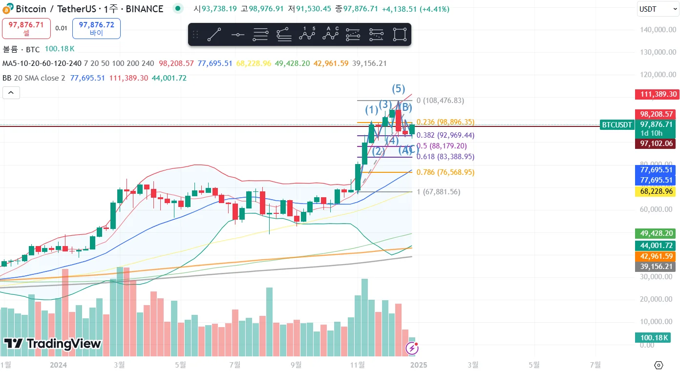 주봉캔들이기 때문에 1/6에 새로운 캔들을 형성할텐데 2일도 안 남은 시점에서 거래량은 적고, 7개 전 캔들의 종가(97900)와 현재 가격이 비슷해서 7일 이동평균선 기울기가 꺾일 수 있거나 너무 완만한 기울기를 만들어 애매할 수 있음..