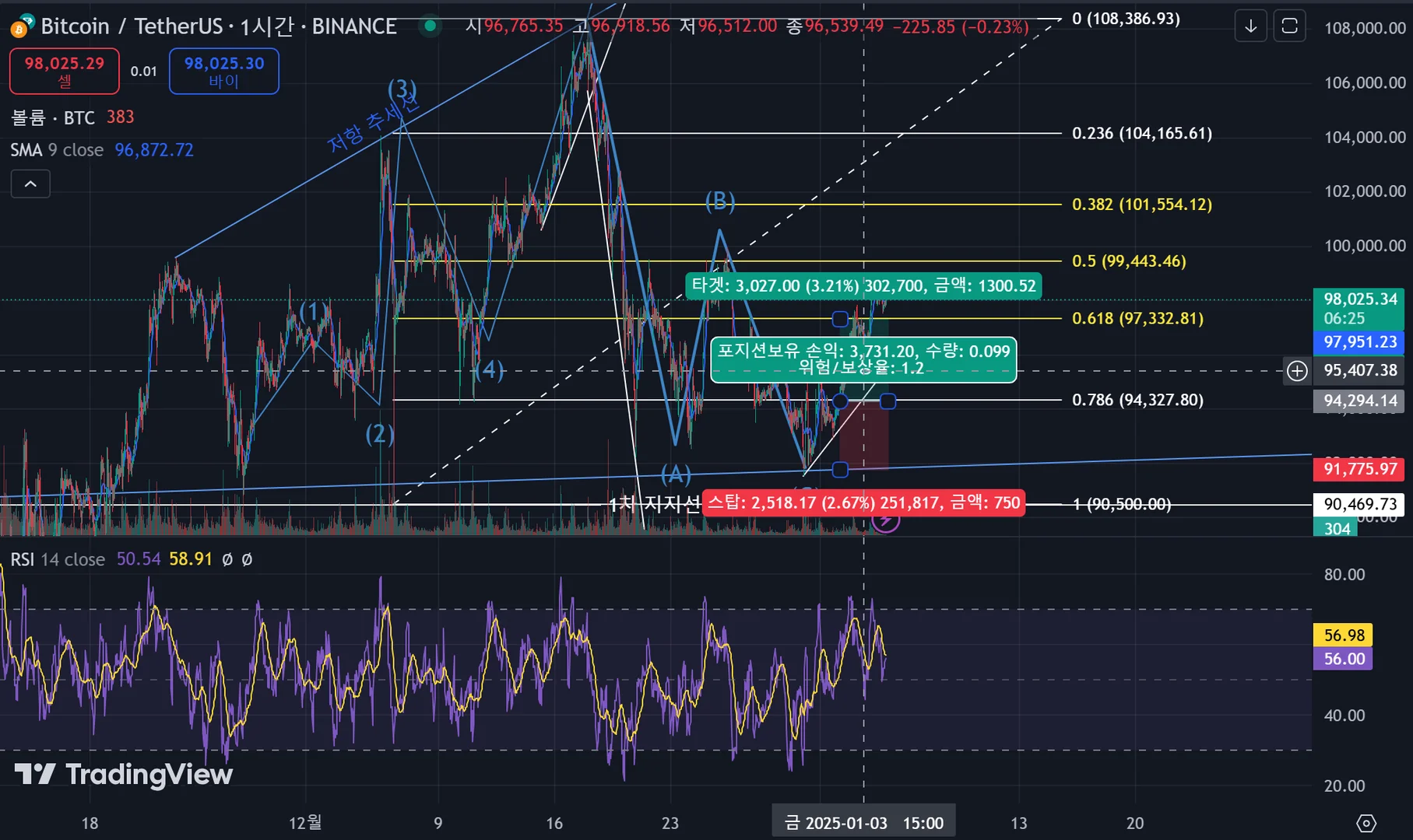 엘리엇 임펄스 파동과 피보나치 되돌림을 중점적으로 사용하여 분석했구요.