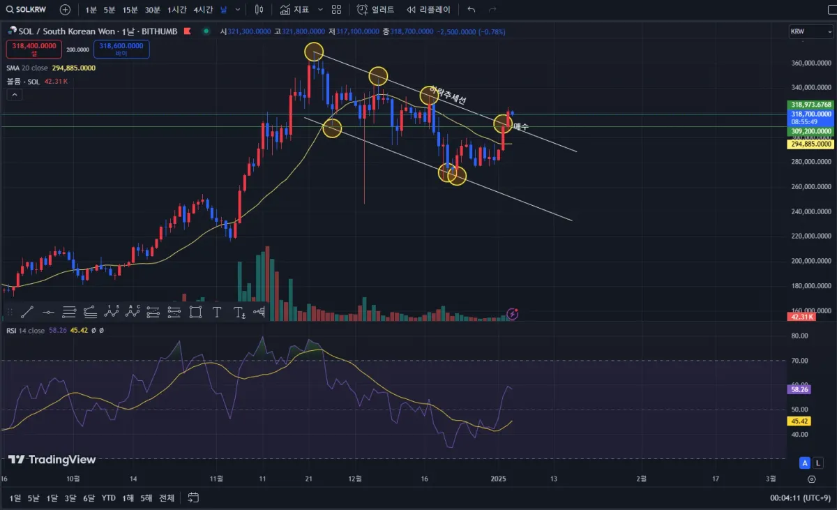 솔라나 일봉으로 하락추세선을 작도하였으며, 4번의 저항 및 3번의 지지를 확인하여, 유의미한 작도라고 판단하였습니다.