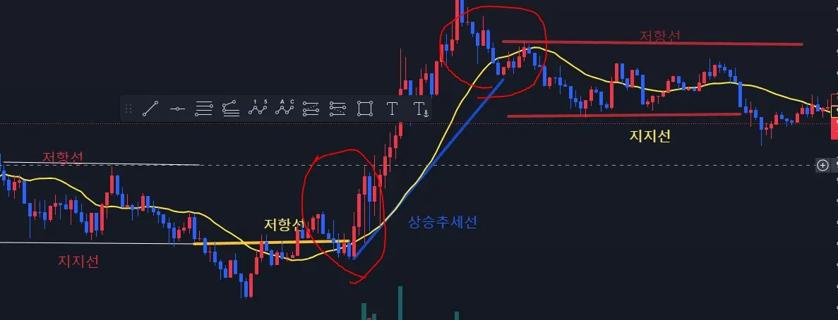 저항선과 지지선의 박스권을 이루다가 저항선을 돌파(빨간색 첫번째 동그라미) 후 상승 추세선 보임(지지선) 추세 전환으로 박스권 형성하게 되었습니다. 저항선과 지지선으로 박스권 형성입니다.