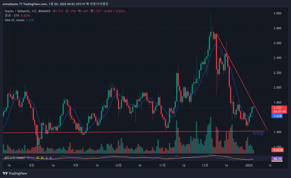 STX의 경우 24년 12월 이후 하락 주세에 있으나 1.4$ 수준에서 지지를 받고 있음.