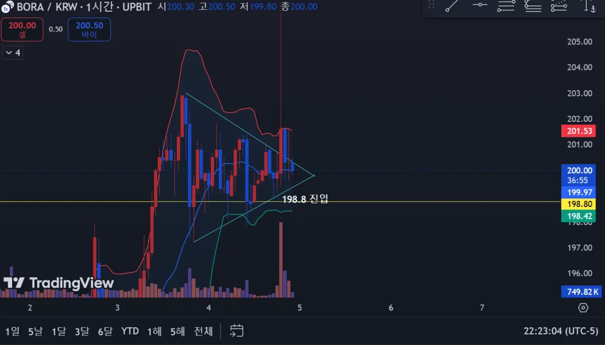 1시간 봉 상 삼각수렴 형태가 나왔습니다. 하방 추세선을 뚫는 모습이 나왔지만 재차 내부로 들어와 마감하는 것을 보고 198.8에 진입했습니다. 강의 때 배운 내용을 100% 소화해서 활용하지는 못했지만 손절라인과 매도 목표를 정할 수 있다는 것 자체만으로 아무것도 몰랐던 몇 주 전보다 성장했다고 느낍니다. 좋은 강의 항상 감사합니다.