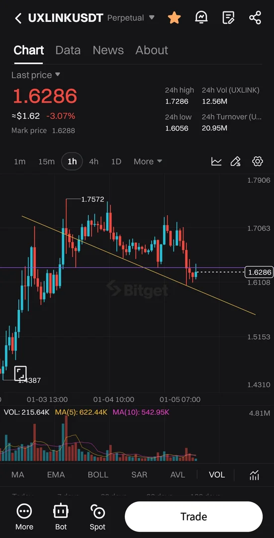 차트는 1시간봉이고 쌍봉패턴&하락추세라 판단했습니다. 하락추세선(노란색)에 닿은후 반등이 나오길래 200테더로 5배 롱 진입했습니다. 이때 익절가는 가장가까운 지지저항선(보라색_1.6373)에 설정했고, 손절가는 반등이 있었던 1.61에 설정했는데 운 좋게 잘 맞았던것 같습니다