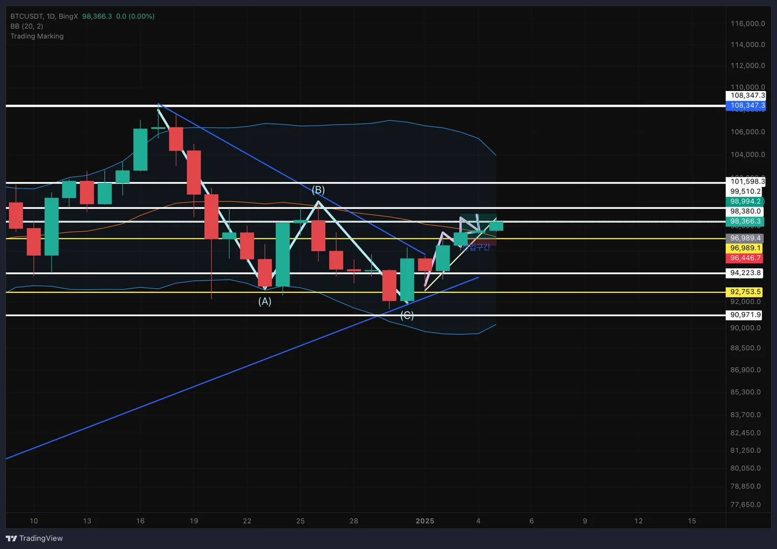일봉 > 4시간봉 > 1시간봉으로 작도하였고 볼린저 밴드로 전체적인 흐름을 읽었습니다