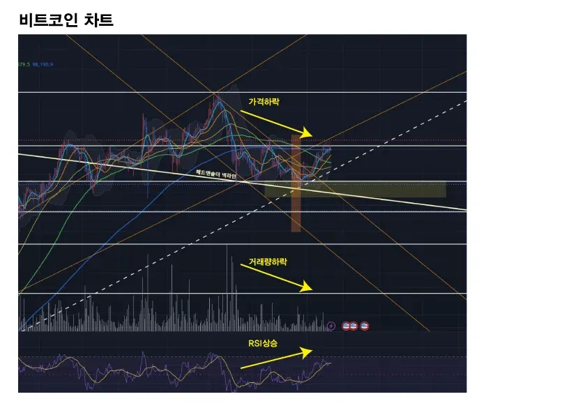 - 비트코인 차트에서 고점과 거래량은 하락하는데 RSI는 조금씩 상승하는 모습체크 (긍정예상)
