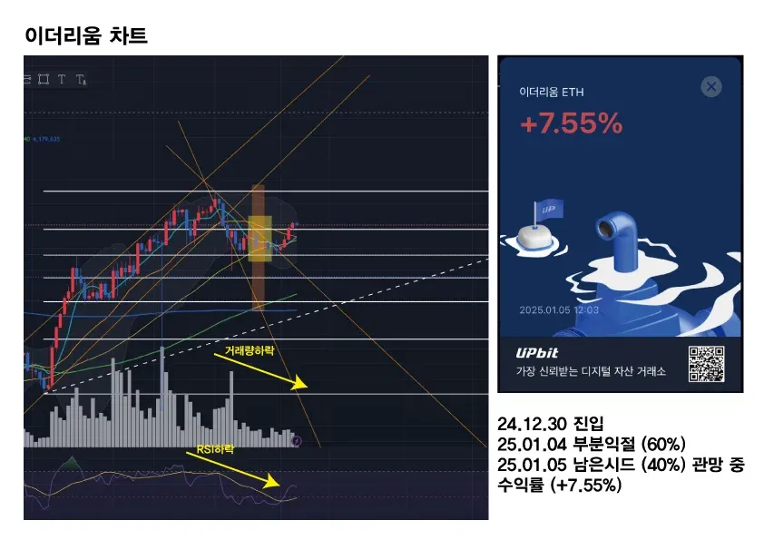 - *이유: 비트코인 차트에서 해드엔 숄더 패턴이 보여지며 저항라인에 걸쳐 다시금 하락세를 예상하고 부분 익절 선택